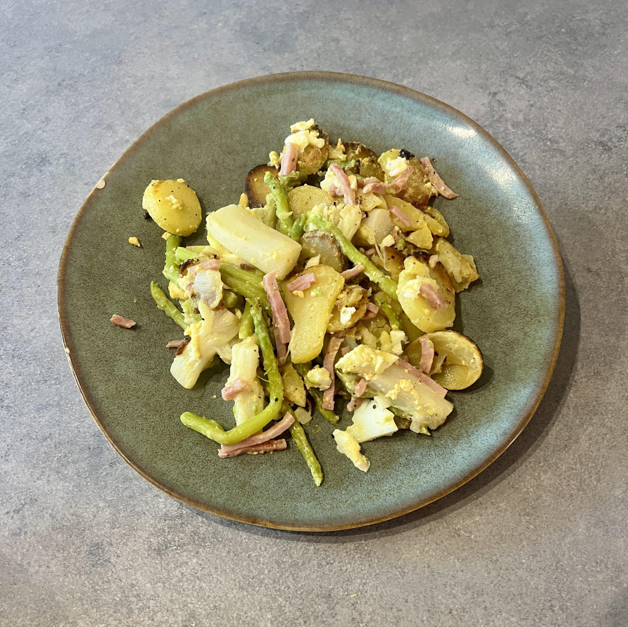 Schep de peterselie en dressing door de asperges, krieltjes en aspergetips. Breng op smaak met peper en eventueel zout. Schep op een platte schaal en verdeel het ei en de hamreepjes erover. Garneer met de achtergehouden peterselie.