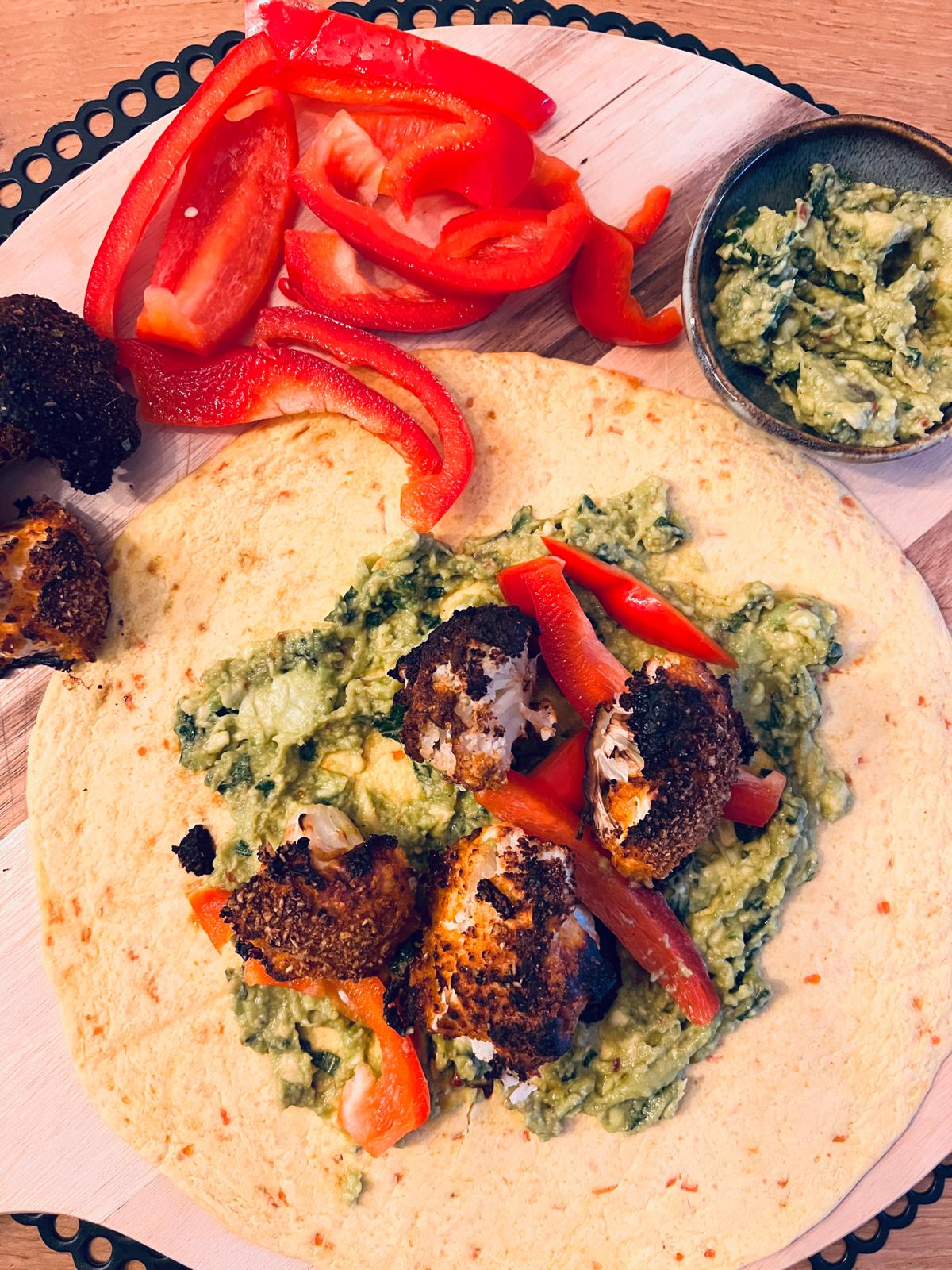 | Verwarm de oven voor op 180 graden. Snijd de bloemkool in roosjes. Pak 2 kommen, vul een met de Griekse yoghurt en de anders met de Crispy Chicken Seasoning mix. Dip de bloemkool roosjes in de yoghurt en daarna in de kruidenmix. Leg ze op een bakplaat bedenkt met bakpapier. Doe dit met alle bloemkool roosjes. Schuif in de oven voor 25-30 minuten. Ondertussen prak je de avocado fijn en snijd je de verse munt klein. Voeg de munt en de Guacamole kruiden toen aan de geprakte avocado’s en roer goed door. Snijd de paprika in reepjes, wij gebruiken ze rauw maar je kunt ze ook prima bakken. Zet alles op tafel en je kunt de wraps zelf opmaken naar smaak en hoeveelheid. |