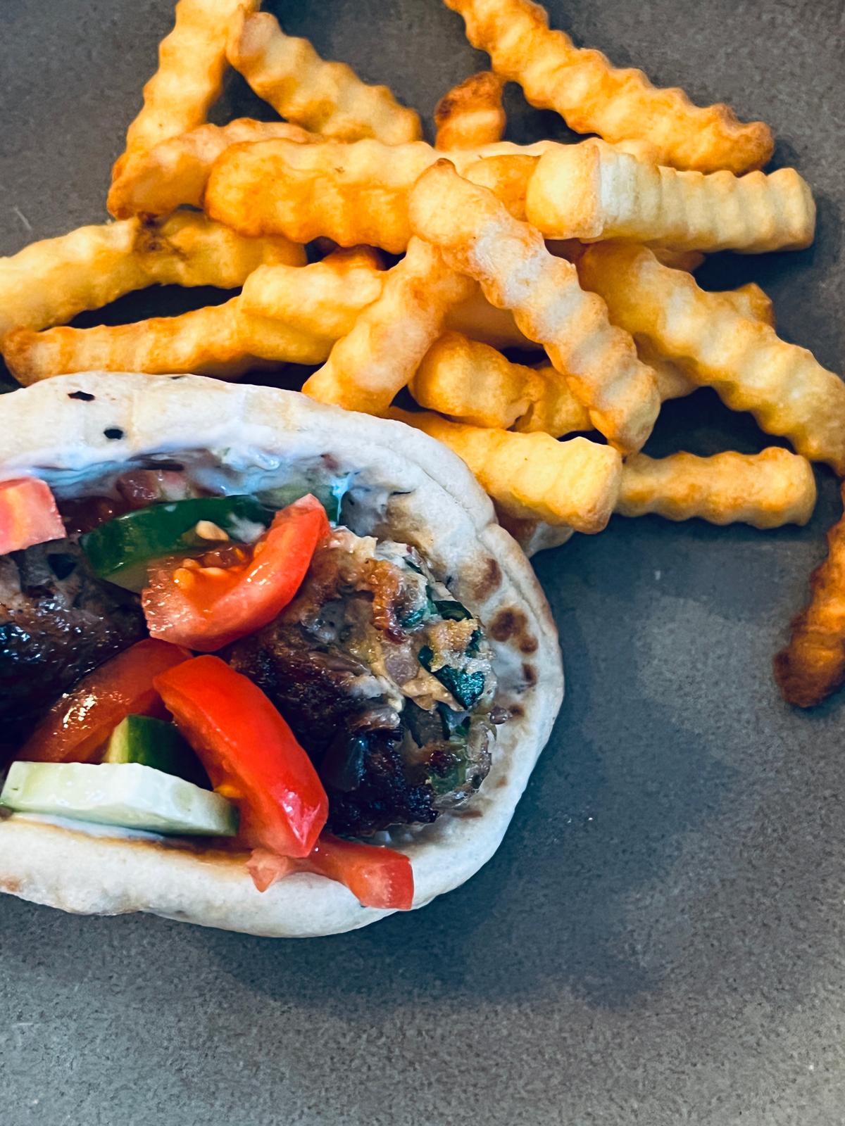 | 1 komkommer, in stukjes 1/2 komkommer, geraspt 2 tomaten, in stukjes 1 teen knoflook, gehakt 450 gr kipgehakt 1/2 rode ui, fijngesneden 1 tl oregano 250 gr spinazie, fijn gehakt 140 gr Griekse yoghurt 2 el citroensap 1/2 gedroogde dille 1/2 tl knoflookpoeder zout en peper naar smaak 4 naanbroden krulfriet |