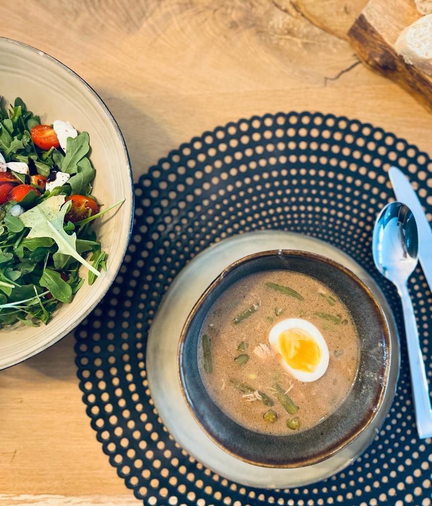 Verdeel de soep over de kommen, leg 2 helften ei in elke kom en voeg wat sambal toe.